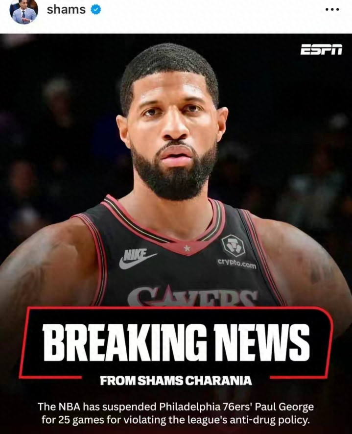 北京时间2月1号,NBA知名记者shams突然爆料称保罗乔治涉嫌违反联盟反毒品协议,将会面临巨大处罚。随后,NBA官方网站便正式公开了对保罗乔治的处罚,对其禁赛25场,将损失1100万美金左右收入。